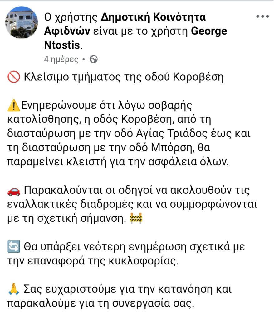 Η Δημοτική Κοινότητα περιορίστηκε σε ανακοίνωση για το κλείσιμο του δρόμου, ωστόσο μέχρι σήμερα δεν έχει υπάρξει καμία παρέμβαση, προκαλώντας έντονη δυσαρέσκεια και εκνευρισμό στους κατοίκους.