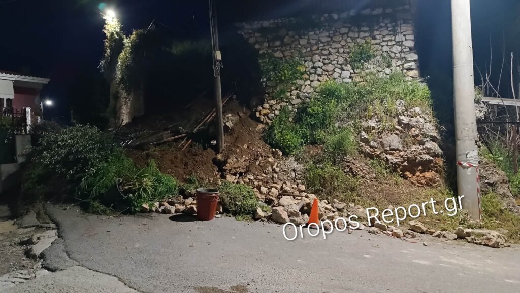 Χώματα και πέτρες έχουν καταλήξει στο οδόστρωμα, με τον δρόμο να παραμένει κλειστός και το σημείο απλώς πρόχειρα σηματοδοτημένο, χωρίς καμία ουσιαστική εργασία αποκατάστασης.