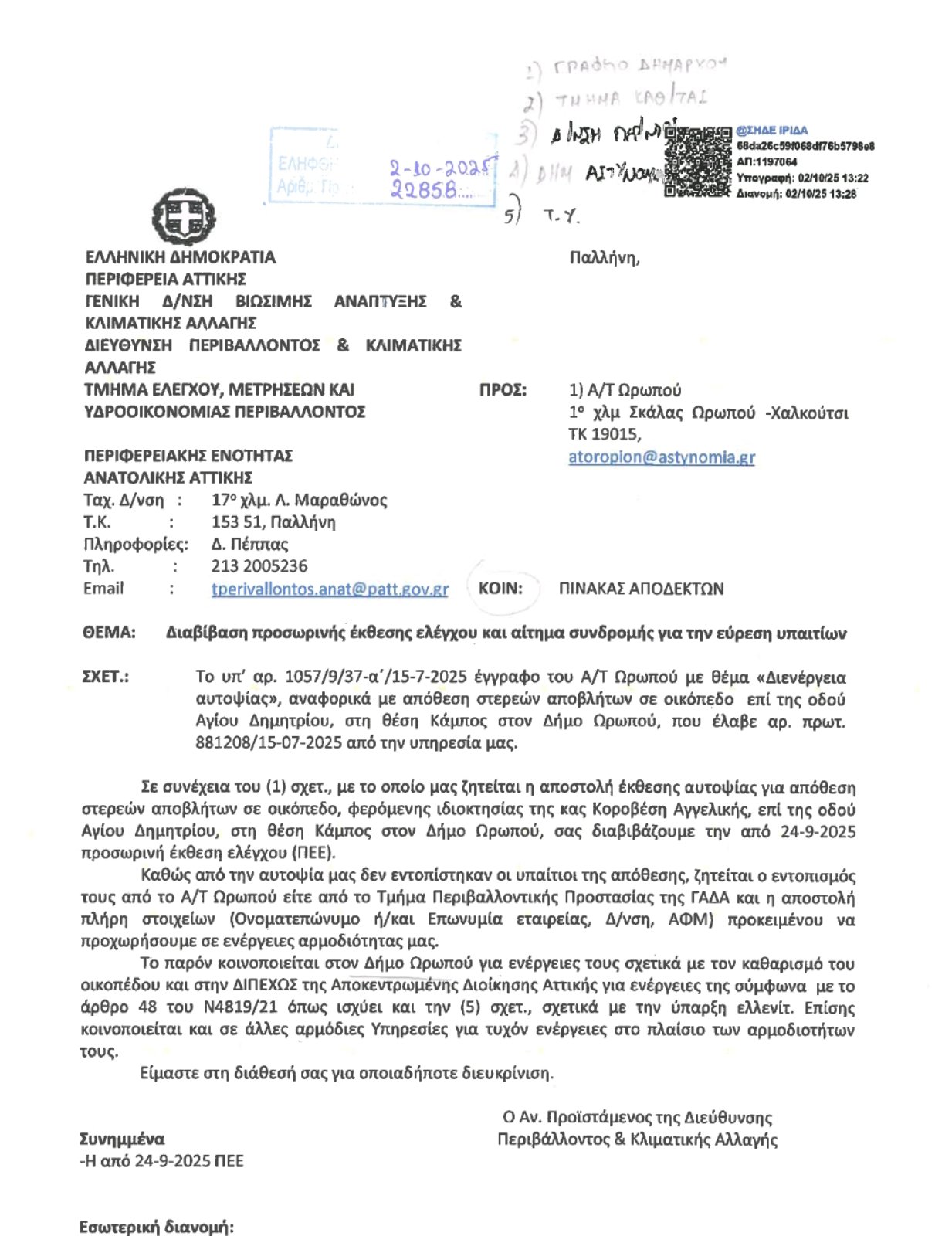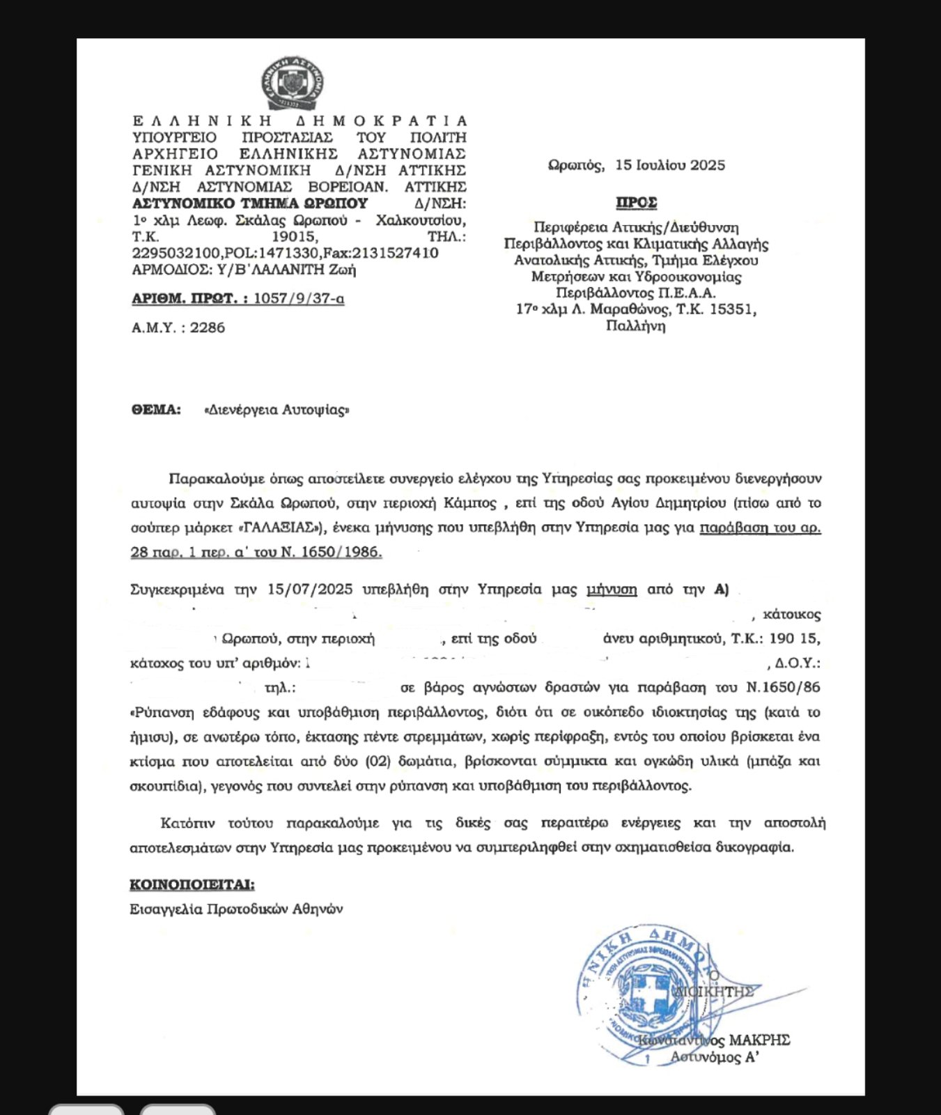 Μετά την υποβολή της μήνυσης, υπήρξε άμεση κινητοποίηση του Αστυνομικού Τμήματος Ωρωπού, το οποίο διαβίβασε την υπόθεση στις αρμόδιες υπηρεσίες, ζητώντας τη συνδρομή τους. Ακολούθως, κλιμάκιο της Διεύθυνσης Περιβάλλοντος & Κλιματικής Αλλαγής της Περιφέρειας Αττικής διενήργησε αυτοψία στον χώρο, συντάσσοντας σχετική έκθεση ελέγχου.