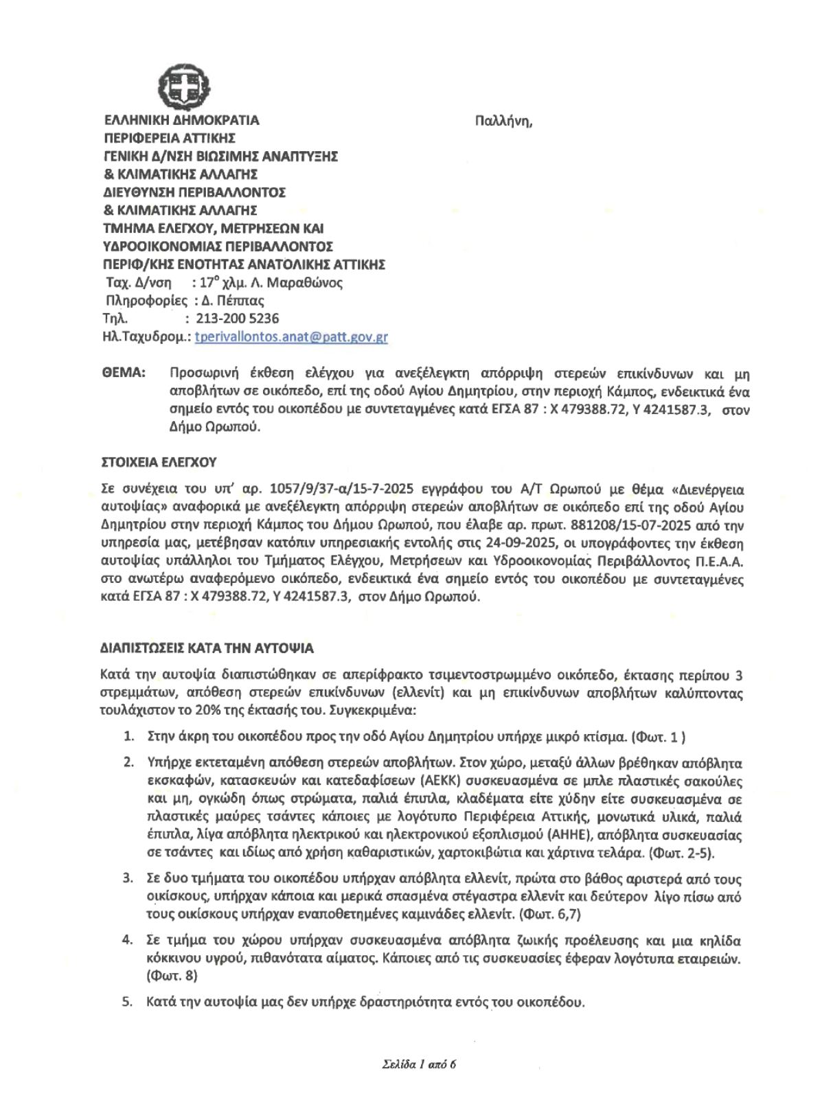 Στο επίκεντρο της επικαιρότητας επανέρχεται το ζήτημα της ανεξέλεγκτης απόθεσης απορριμμάτων σε ιδιωτικό οικόπεδο πλησίον του Δημαρχείου Ωρωπού. Η υπόθεση, η οποία έχει απασχολήσει και στο παρελθόν την τοπική κοινωνία, λαμβάνει νέες διαστάσεις κατόπιν επίσημων εγγράφων και αυτοψιών που βλέπουν το φως της δημοσιότητας.