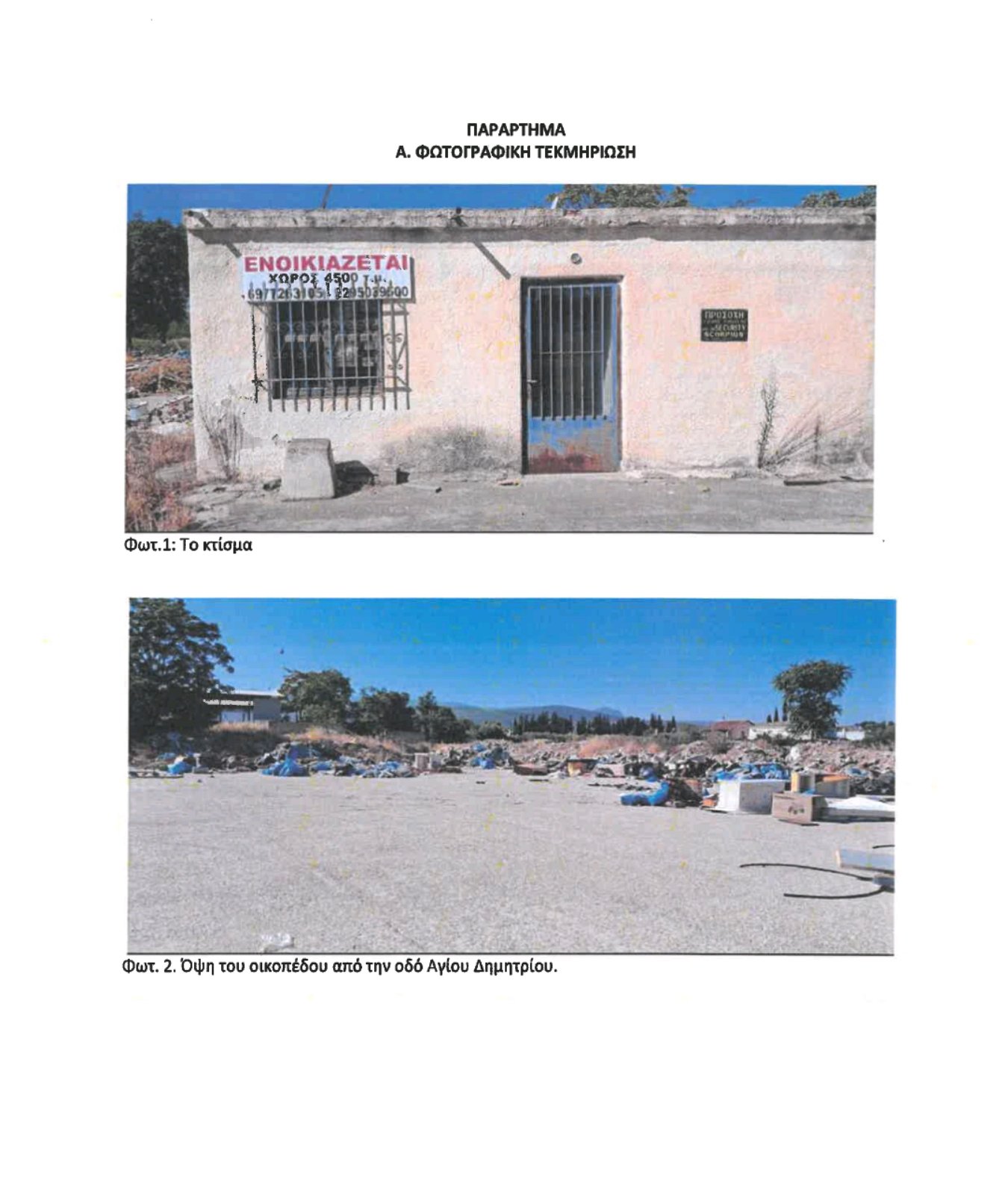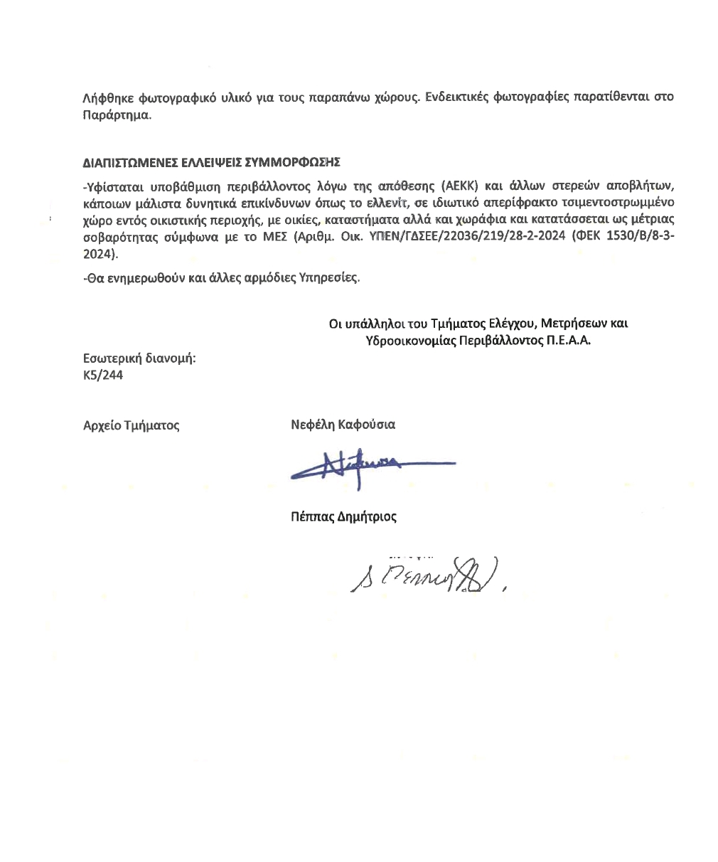 - Καταγράφηκε ανεξέλεγκτη απόρριψη στερεών αποβλήτων σε έκταση περίπου 3 στρεμμάτων, καλύπτοντας τουλάχιστον το 20% του οικοπέδου.