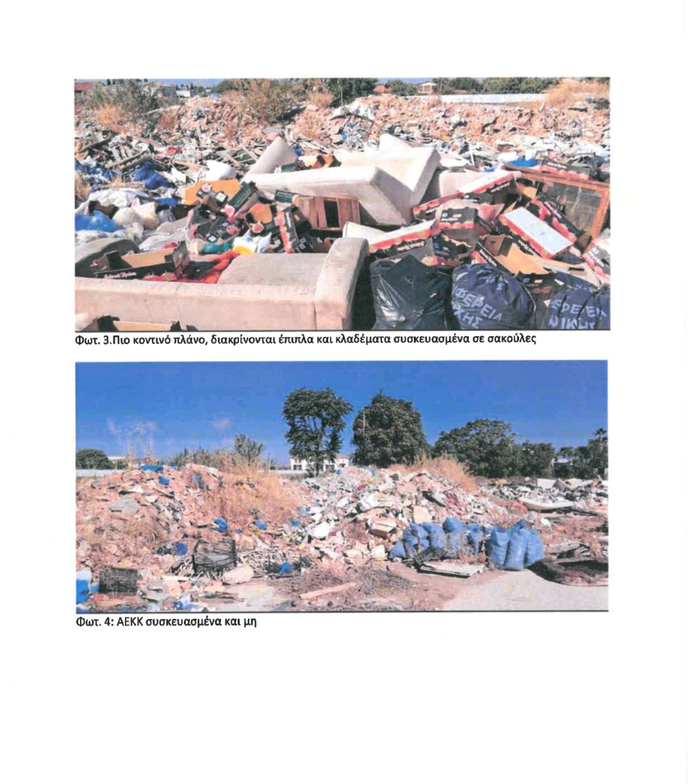 - Στον χώρο βρέθηκαν ογκώδη αντικείμενα (έπιπλα, στρώματα), οικιακά απορρίμματα, καθώς και απόβλητα ηλεκτρικού και ηλεκτρονικού εξοπλισμού.