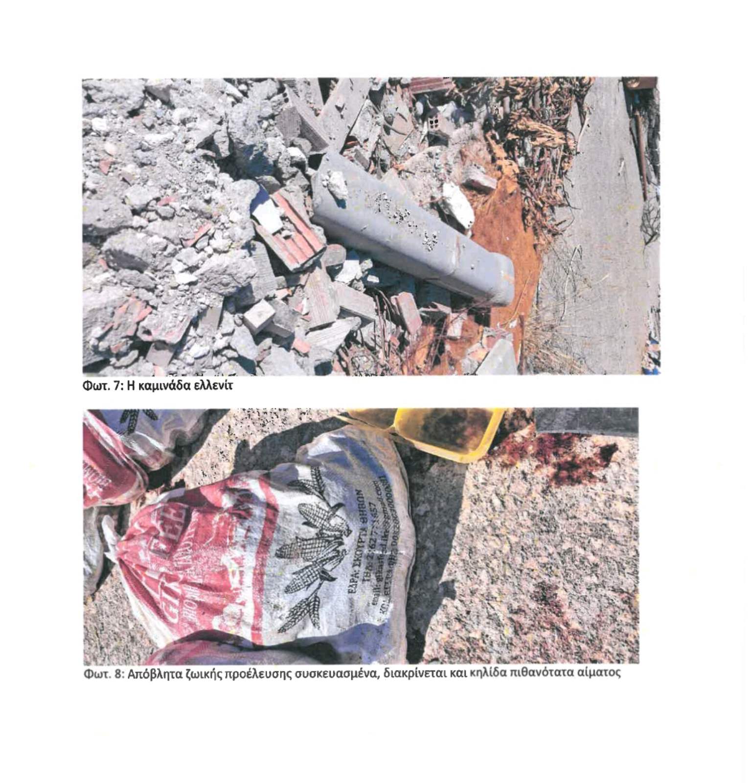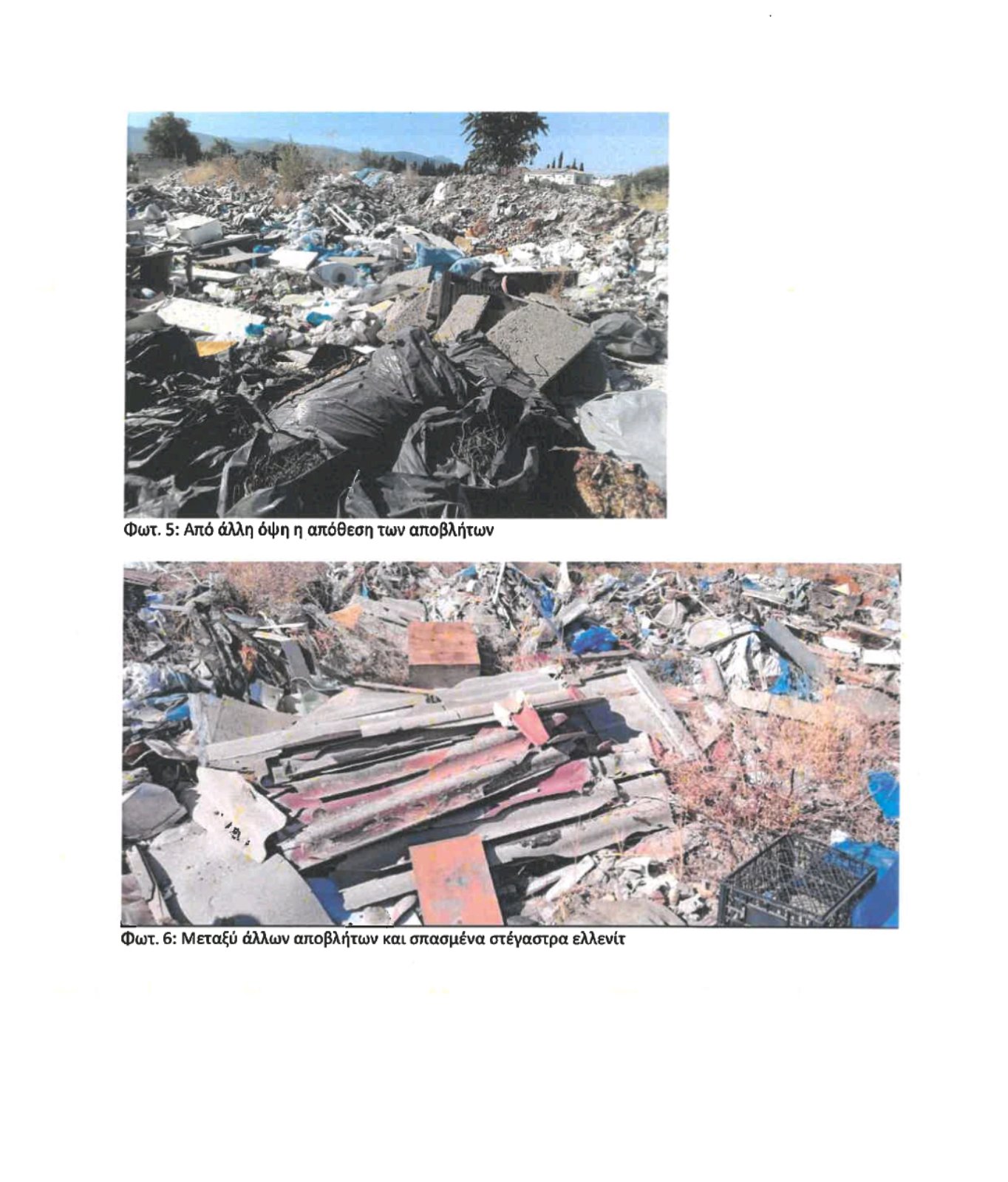 Συγκεκριμένα, καταγράφηκε η παρουσία υλικών αμιάντου (ελλενίτ) σε μορφή σπασμένων στεγάστρων και καμινάδων, τα οποία βρίσκονται εκτεθειμένα χωρίς την απαιτούμενη προστασία ή σήμανση. Υπενθυμίζεται ότι τα αμιαντούχα υλικά είναι καρκινογόνα και η διαχείρισή τους διέπεται από αυστηρό νομοθετικό πλαίσιο λόγω της επικινδυνότητάς τους για τη δημόσια υγεία. Επιπλέον, εντοπίστηκαν απόβλητα ζωικής προέλευσης, στοιχείο που επιβαρύνει περαιτέρω την υγειονομική εικόνα της περιοχής.