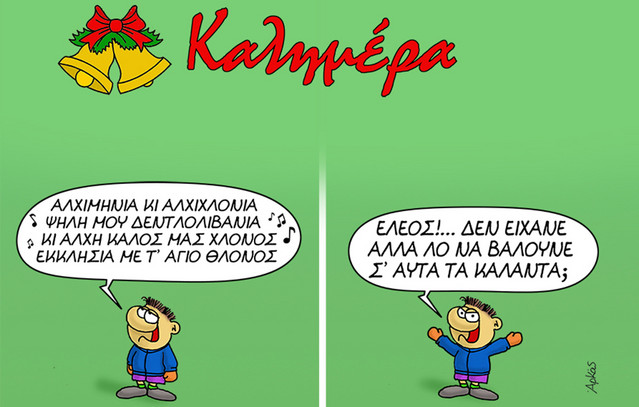 Στο εμπνευσμένο σκίτσο, ο μικρός Θανασάκης αναλαμβάνει να πει τα κάλαντα, αλλά με έναν τρόπο που μόνο εκείνος ξέρει! Οι λέξεις “χάνουν” το νόημά τους καθώς παραμορφώνονται από τη συνεχή προσθήκη της συλλαβής “λο”. Το αποτέλεσμα είναι ένας λόγος που ακούγεται γνώριμος, αλλά ταυτόχρονα τελείως ακατανόητος, προκαλώντας γέλιο και προβληματισμό.