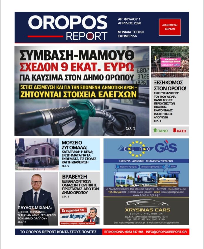 Αύριο Τετάρτη 8/4/2026 (το απόγευμα) κυκλοφορεί το 1ο έντυπο φύλλο του Oropos Report