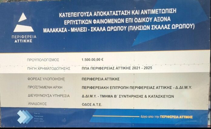 Ξεκινούν τις επόμενες ημέρες οι εργασίες αποκατάστασης και αντιμετώπισης ερπιστικών φαινομένων στον οδικό άξονα Μαλακάσας – Μηλεσίου – Σκάλας Ωρωπού, κοντά στη Σκάλα Ωρωπού, από τις υπηρεσίες της Περιφέρειας Αττικής.