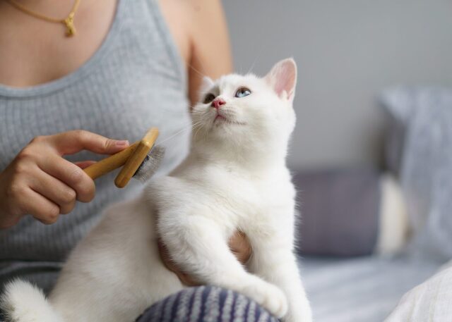 Η τακτική περιποίηση με ειδικές βούρτσες, προσαρμοσμένες στον τύπο τριχώματος της γάτας, απομακρύνει τις νεκρές τρίχες, μειώνει το σχηματισμό τριχόμπαλων και ενισχύει τον δεσμό μεταξύ ζώου και ιδιοκτήτη. Σε ορισμένες περιπτώσεις, κυρίως σε μακρύτριχες φυλές, ενδείκνυται η επαγγελματική περιποίηση.