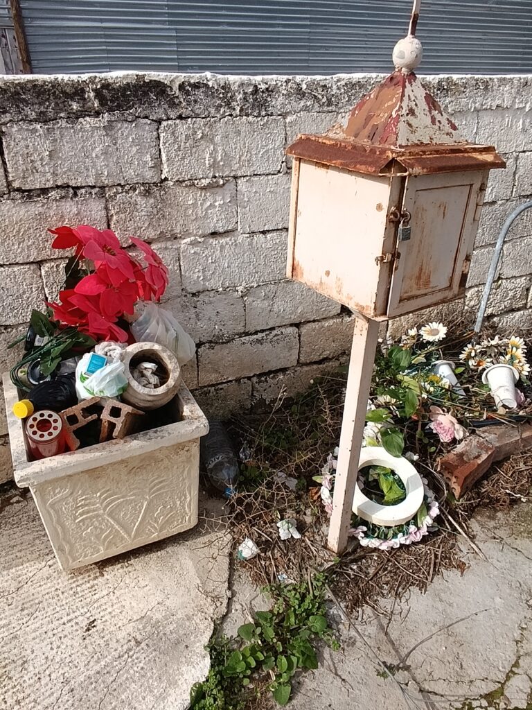 Σκουπίδια, πλαστικά μπουκάλια, ξερά στεφάνια παρατημένα.