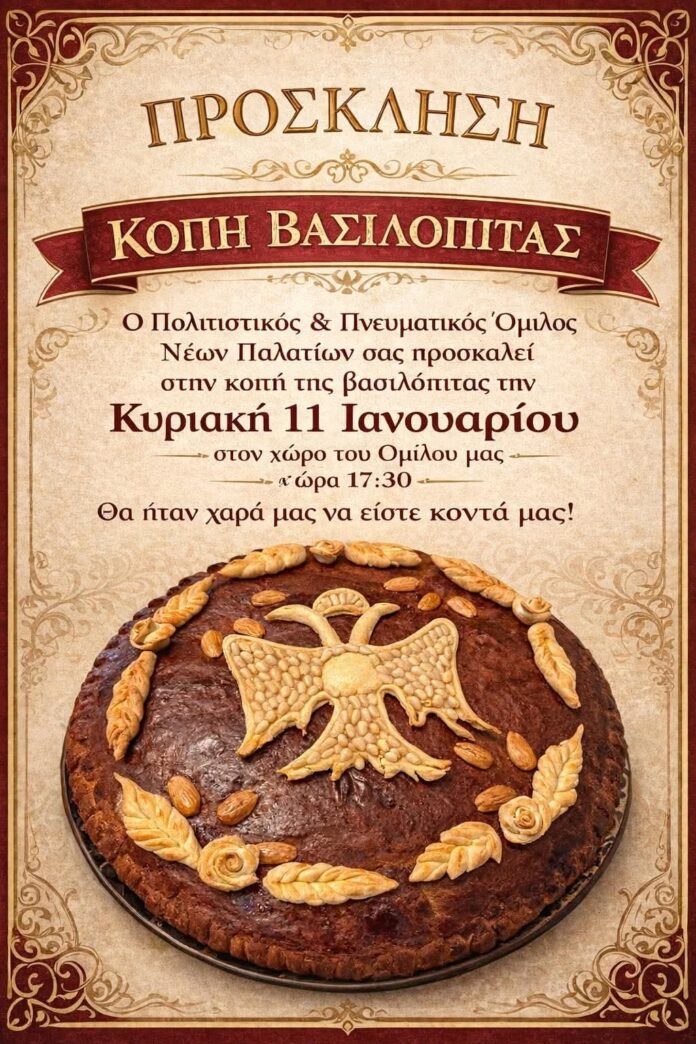Με την καθιερωμένη ζεστασιά και σε εορταστικό κλίμα, ο Πολιτιστικός & Πνευματικός Όμιλος Νέων Παλατίων προσκαλεί τα μέλη και τους φίλους του στην κοπή της πρωτοχρονιάτικης βασιλόπιτας.