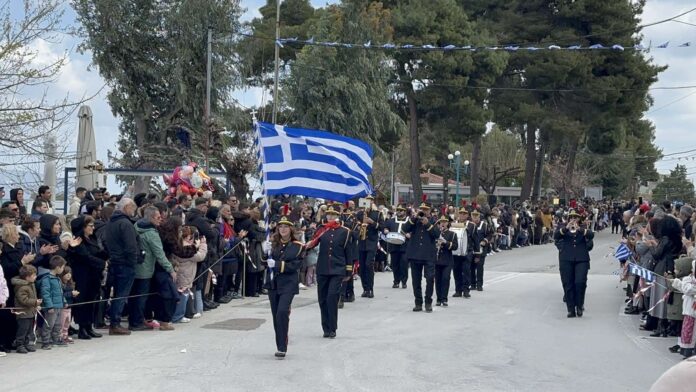 Με τους επιβλητικούς ήχους της Φιλαρμονικής του Δήμου Ωρωπού άνοιξε σήμερα η μεγάλη παρέλαση για την επέτειο της 25ης Μαρτίου στον παραλιακό δρόμο των Νέων Παλατίων.