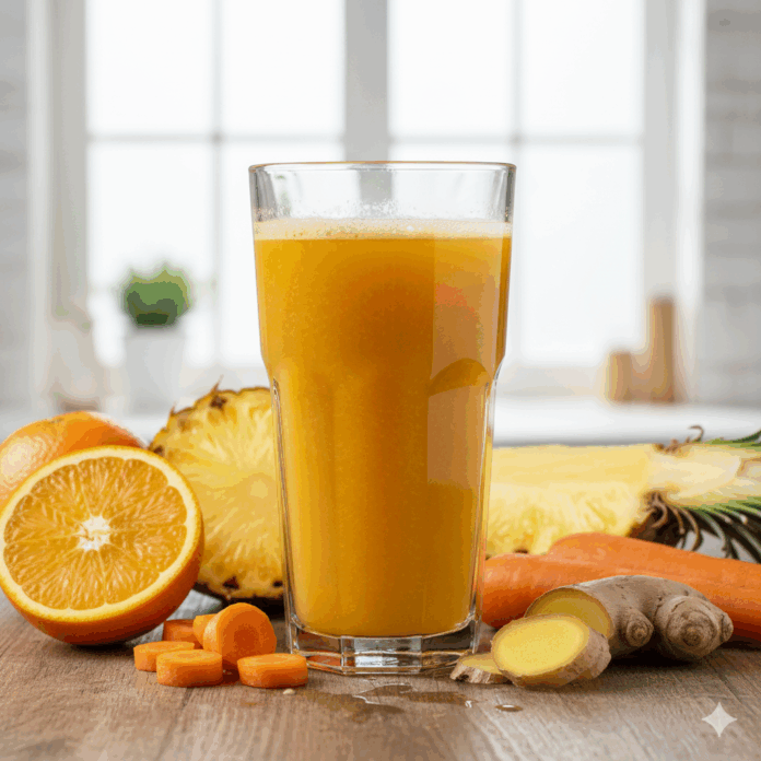 Αναζητάτε έναν φυσικό τρόπο να ενισχύσετε τον οργανισμό σας και να ξεκινήσετε τη μέρα σας με ενέργεια ή να αναζωογονηθείτε το απόγευμα; Ο χυμός από πορτοκάλι, ανανά, καρότο και τζίντζερ είναι η ιδανική επιλογή! Πλούσιος σε βιταμίνες, μέταλλα και αντιοξειδωτικά, αυτός ο συνδυασμός προσφέρει όχι μόνο μια εκρηκτική γεύση, αλλά και πληθώρα οφελών για την υγεία σας.
