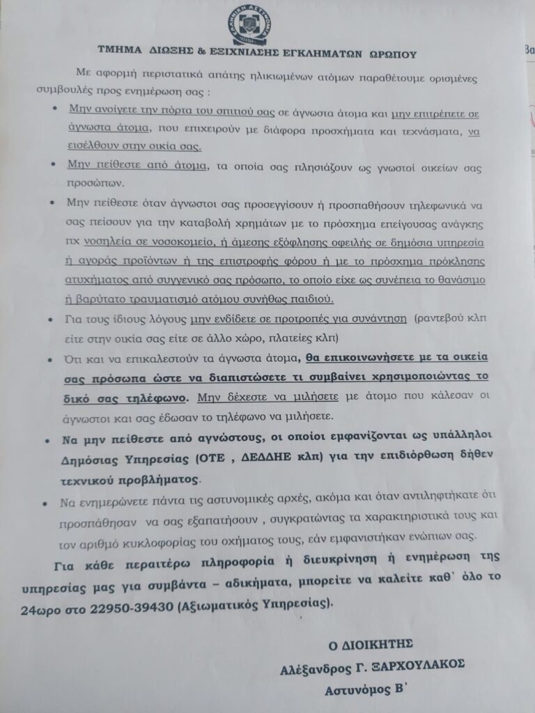 Η πρωτοβουλία εντάσσεται στο πλαίσιο της πρόληψης και της άμεσης ενημέρωσης των πολιτών, με στόχο τον περιορισμό των περιστατικών εξαπάτησης και την ενίσχυση του αισθήματος ασφάλειας στους ηλικιωμένους του Δήμου Ωρωπού.