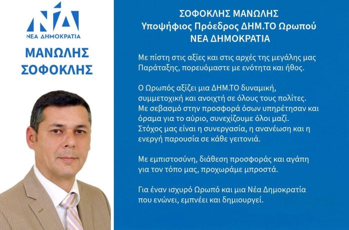 Με σεβασμό στις αρχές και τις αξίες της Νέας Δημοκρατίας, αποφάσισα να θέσω υποψηφιότητα για την προεδρία της ΔΗΜ.Τ.Ο. Ωρωπού.