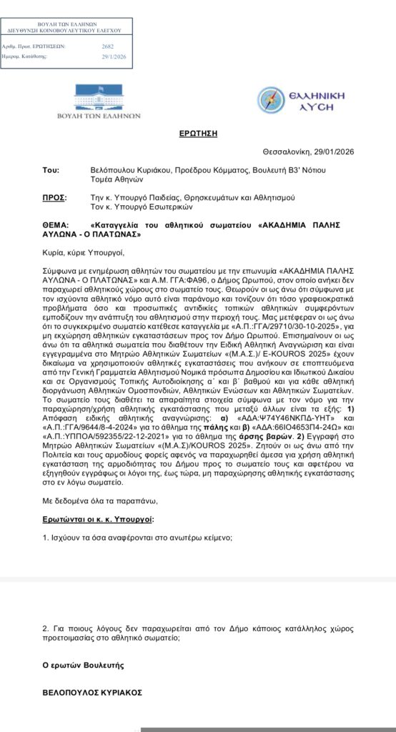 Στο ανώτατο κοινοβουλευτικό επίπεδο φτάνει πλέον το σοβαρό ζήτημα της μη παραχώρησης αθλητικού χώρου στο ιστορικό και αναγνωρισμένο σωματείο «Ακαδημία Πάλης Αυλώνα – Ο Πλάτωνας», που δραστηριοποιείται στον Δήμο Ωρωπού.