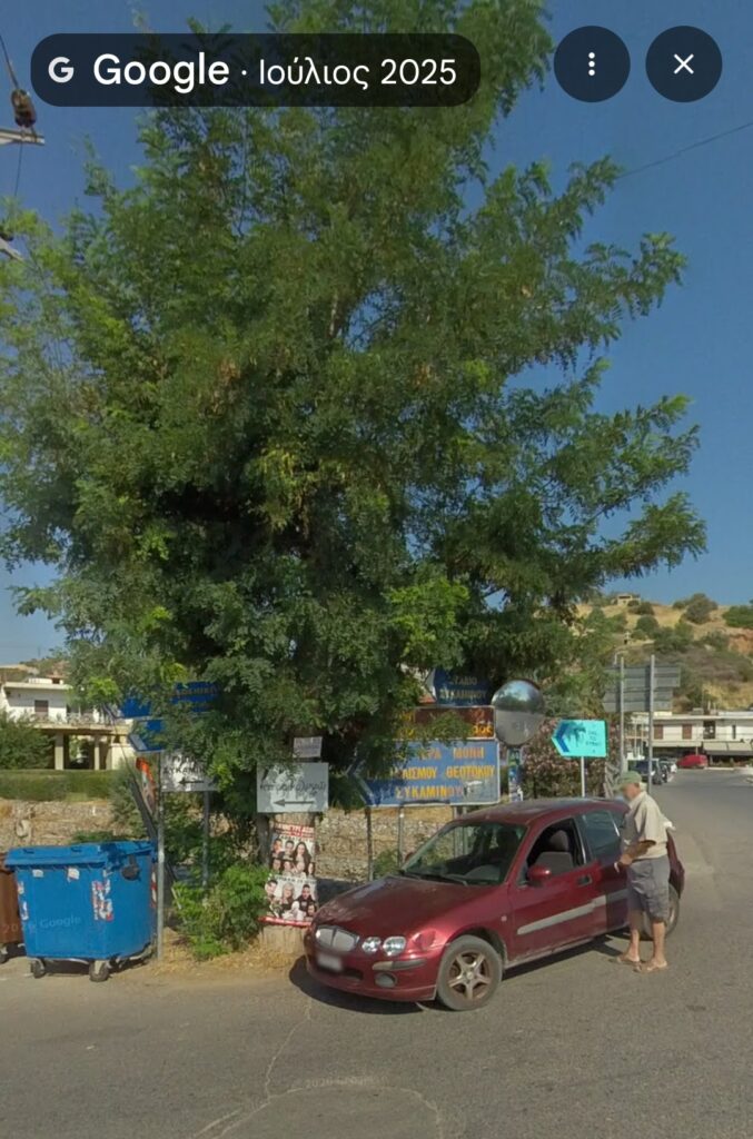 📍 Το 2024 και το 2025, η περιοχή εμφανίζεται με έντονη βλάστηση, ώριμα δέντρα και μια στοιχειώδη περιβαλλοντική ισορροπία. Κάδοι απορριμμάτων, ακόμη και καθρέπτης που βοηθά τους οδηγούς να βγαίνουν με ασφάλεια από το γεφύρι!
