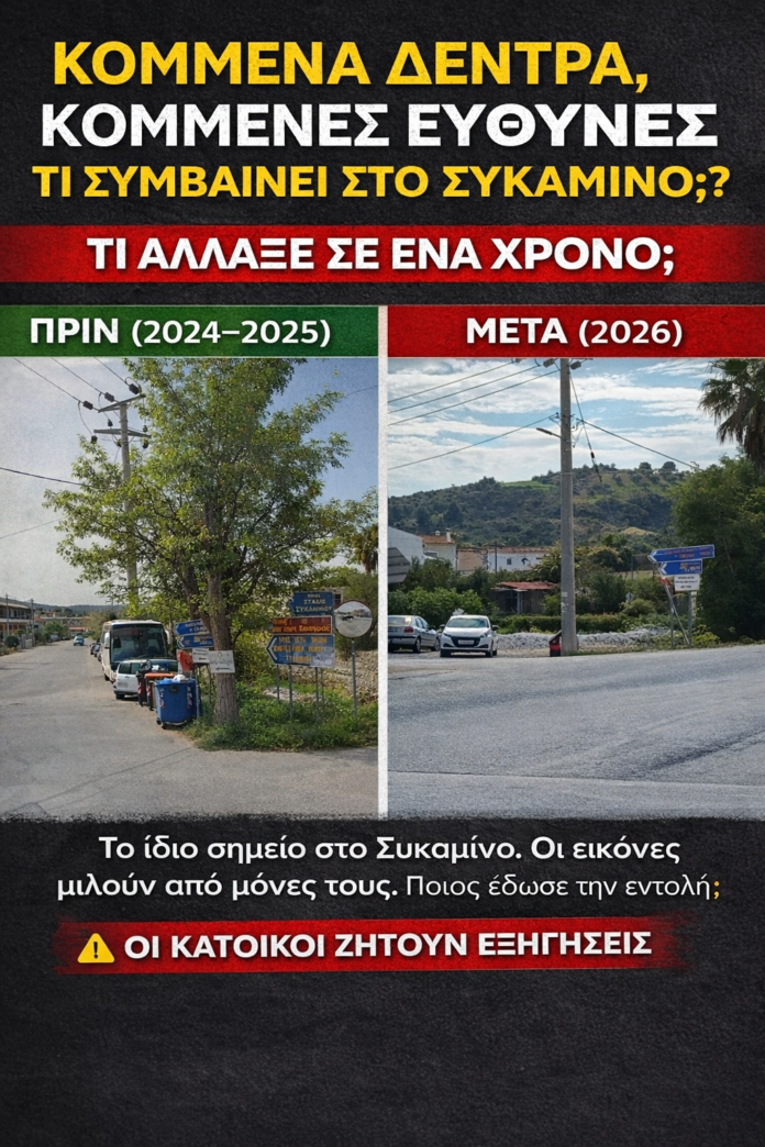 📍 Τον Απρίλιο του 2026, το τοπίο έχει μετατραπεί δραματικά: δέντρα κομμένα, βλάστηση εξαφανισμένη, μια εικόνα πλήρους αποψίλωσης, χωρίς κάδους και με τον καθρέφτη… σπασμένο!