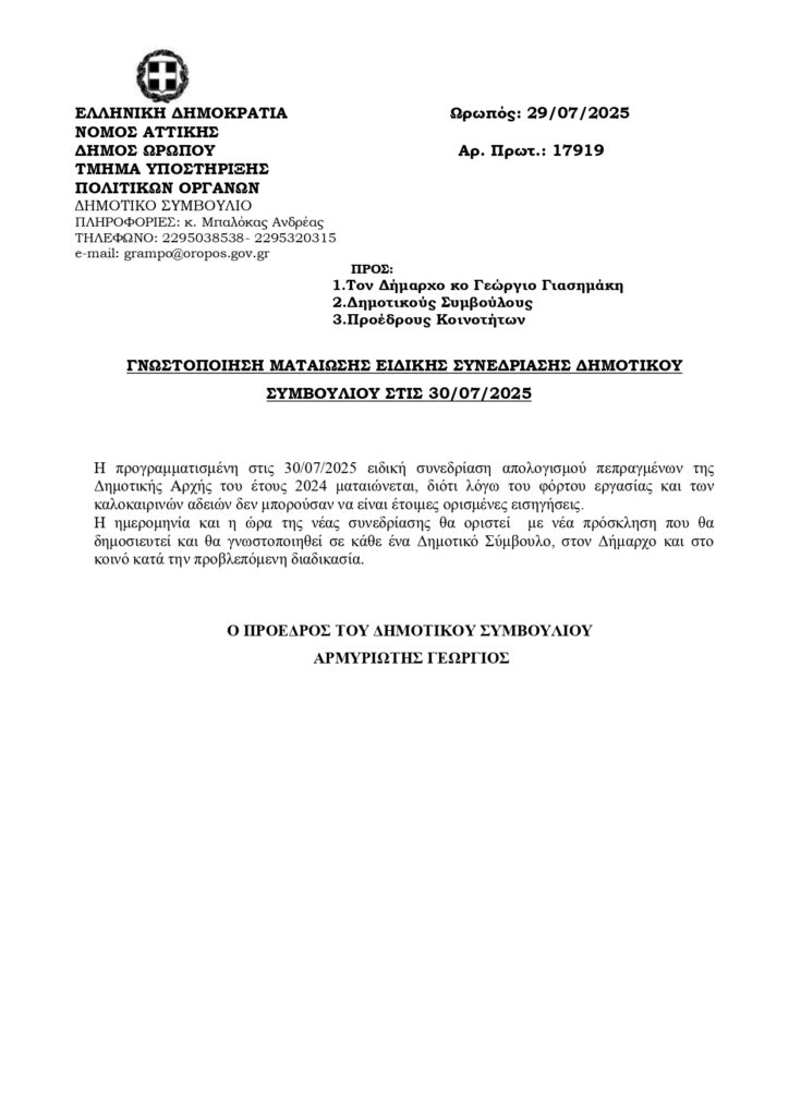 Η Δημοκρατία στον Δήμο Ωρωπού φαίνεται πως έχει τεθεί σε καθεστώς «αφασίας» διαρκείας. Σε μια κίνηση που αγγίζει τα όρια της θεσμικής εκτροπής, η Ειδική Δημόσια Συνεδρίαση του Δημοτικού Συμβουλίου για τον “Απολογισμό Πεπραγμένων της Δημοτικής Αρχής”, η οποία η οποία σύμφωνα με τον νόμο έπρεπε να είχε πραγματοποιηθεί έως τις 30 Ιουλίου 2025, όχι μόνο ματαιώθηκε την τελευταία στιγμή, αλλά φαίνεται πως παραπέμφθηκε οριστικά στις καλένδες.